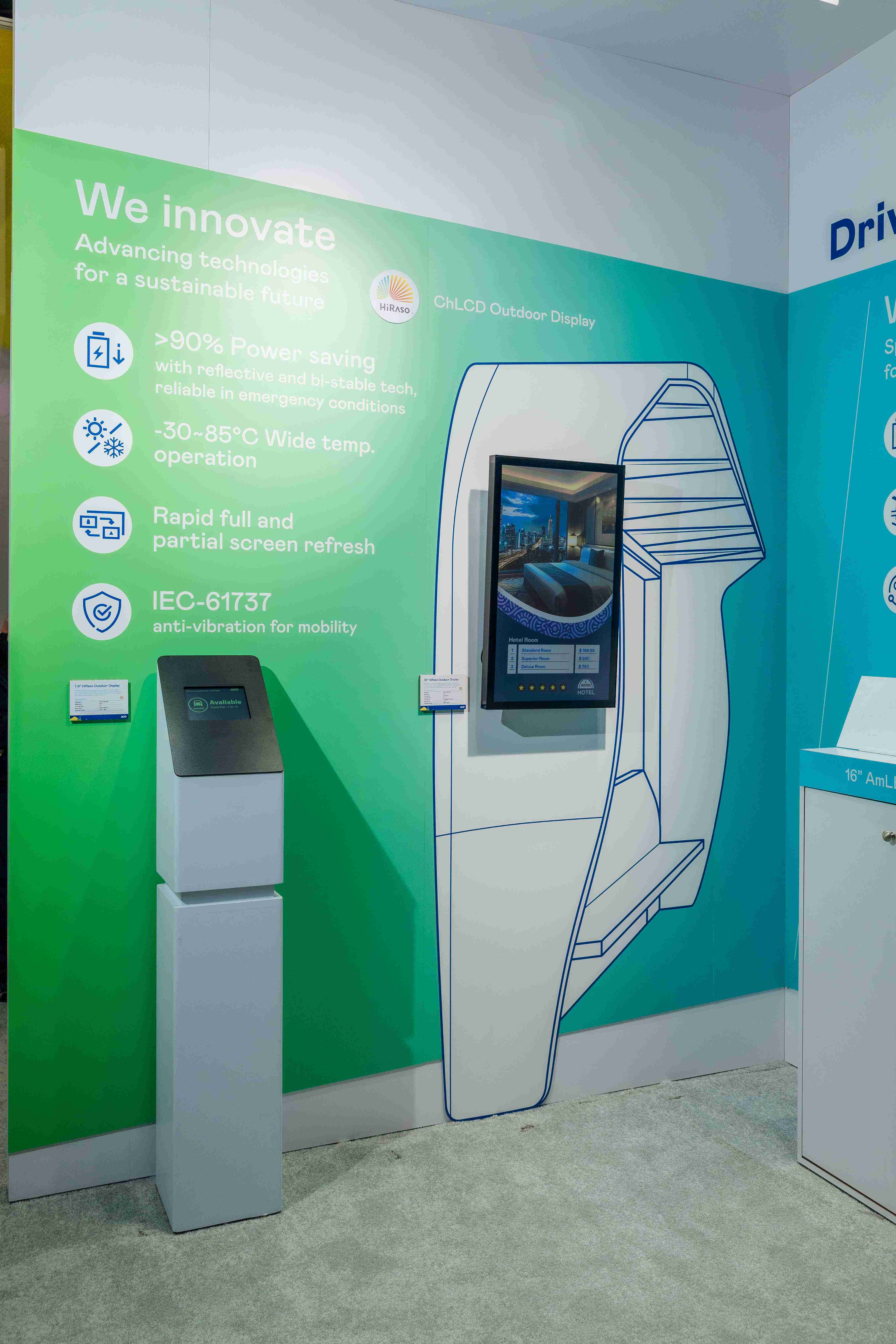 HiRaso胆固醇液晶显示器运用反射环境光线的方式,,呈现影像显示时零耗能的环保省电诉求,,光线愈强愈能呈现绝佳的色彩饱和度及显示效果,,,,同时在摄氏-30度至85度间宽温的使用优势,,为户外电子看板的新首选。。