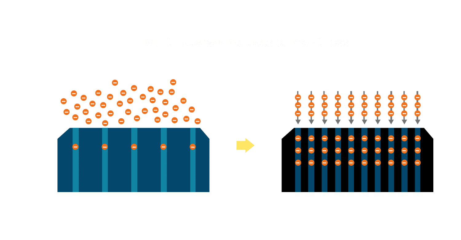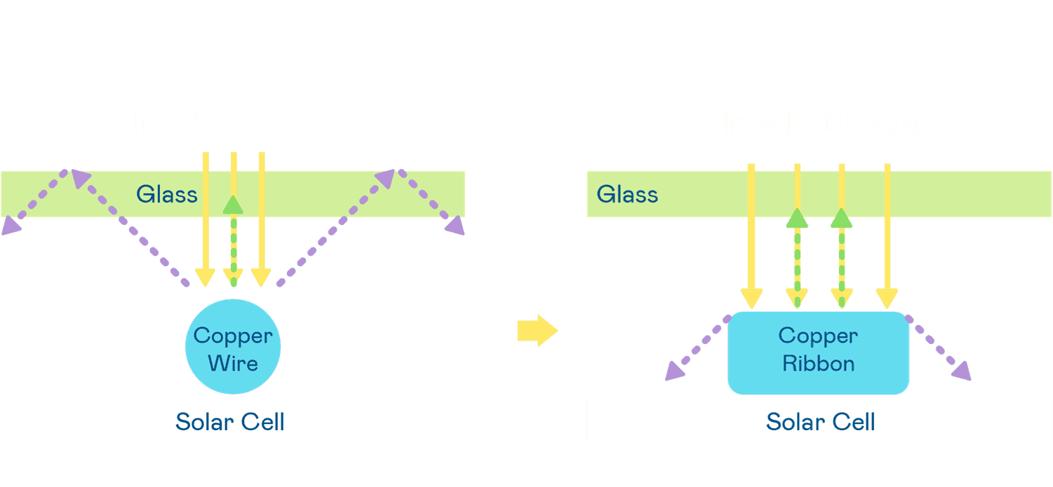 - 电池使用多条铜导线 (Copper wire) 于电池片上形成较短的电流路径,,,提高电流收集效率,,,采用圆形设计的铜导线较传统扁平式的铜焊带 (Ribbon),,,可增加入射至电池的光线量。。。