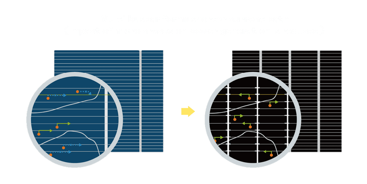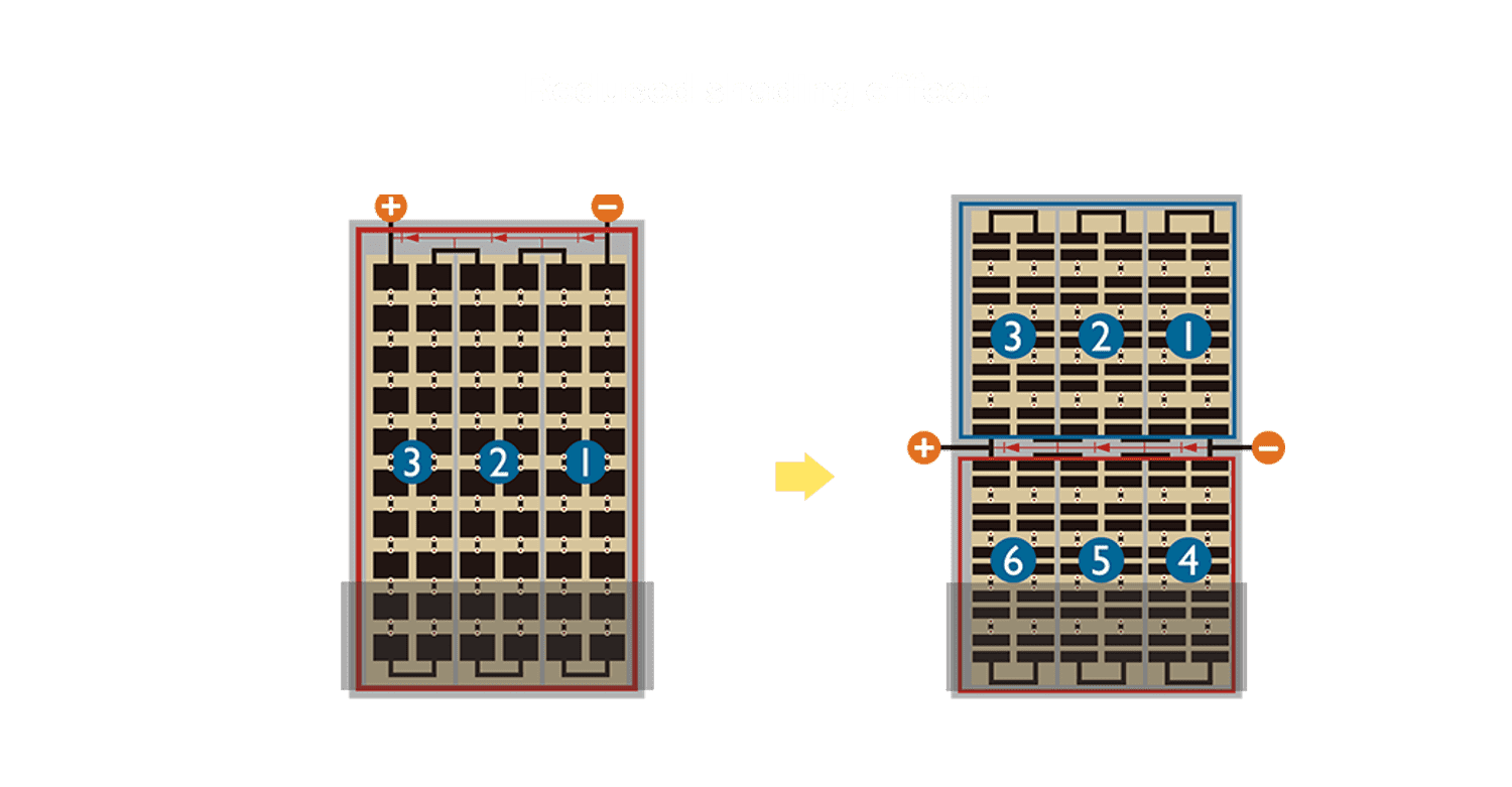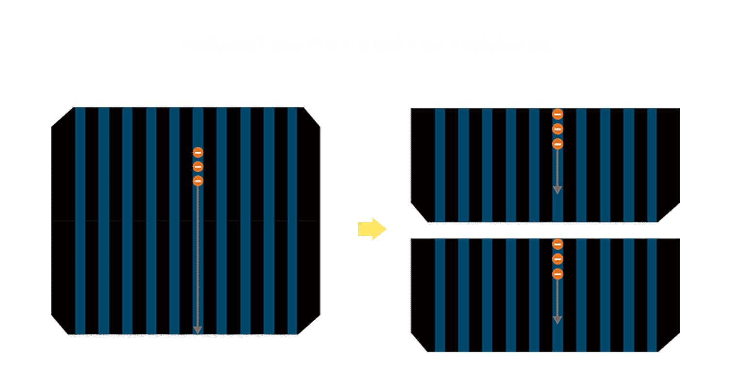 - 结合半切电池,,降低遮阴影响、、、提升模组抗隐裂能力、、、、并减少电阻损耗,,,进一步提升模组发电效能。。